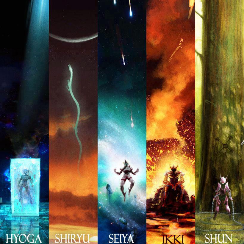 Desenho por algum artista desconhecido com os cinco protagonistas: Seiya de Pégaso, Shiryu de Dragão, Shun de Andrômeda, Hyoga de Cisne e Ikki de Fênix.
